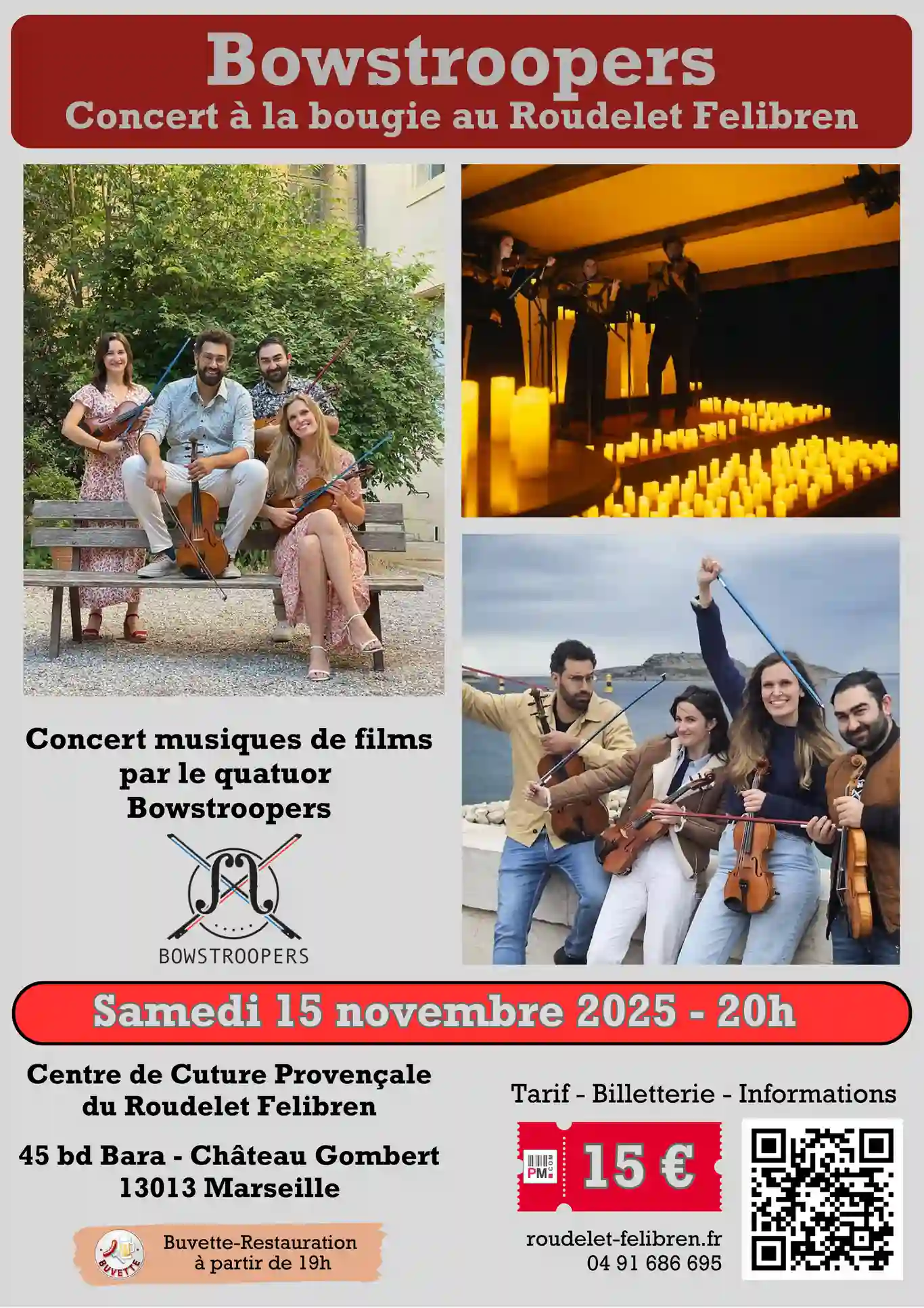 Lire la suiteBowstroopers est un quatuor composé de trois violonistes et d'un altiste issu de l'orchestre d'Aix Marseille. Ils possèdent deux répertoires : la pop culture (musiques de films, séries, jeux vidéos, animations) et les reprises de musiques Pop Rock dans le style de la Série Bridgerton