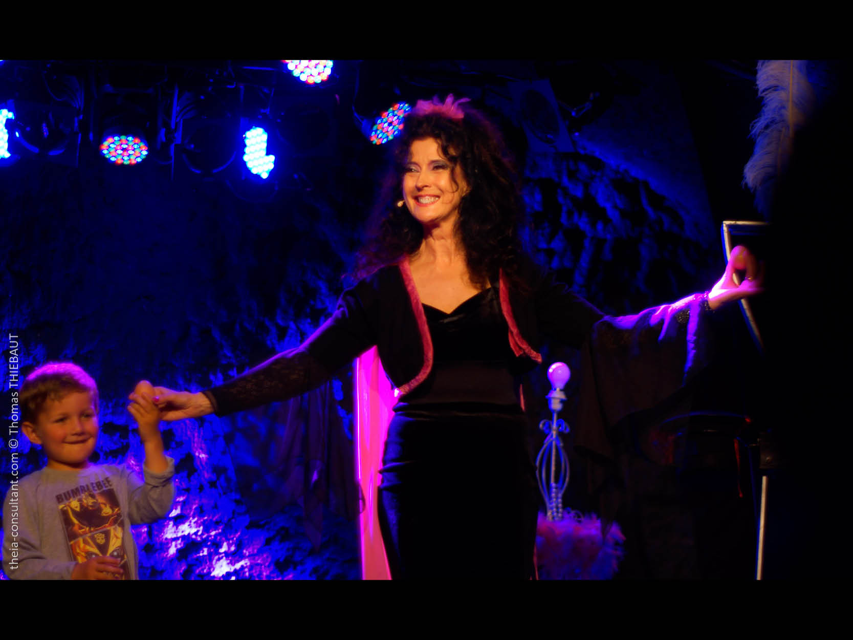 Magicienne professionnelle, les tours sont bluffant et les parents sont tout autant étonnés : une aiguille qui transperce un ballon, un poisson rouge qui apparaît d'un breuvage magique ou encore un guéridon qui vole.